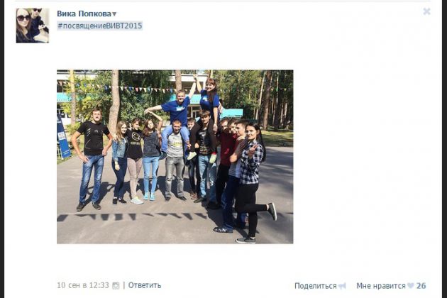 Друзья! С 10 по 20 сентября в ВКонтакте и Instagram вы делились самыми яркими и интересными моментами посвящения первокурсников с хэштегом #посвящениеВИВТ2015. Мы рады сообщить о том, что фотоконкурс завершился и определились 2 победителя, набравшие максимальное количество лайков. Это Вика Попкова (ВКонтакте) и no_lik (Instagram). Как и обещали, победители получают призы c символикой ВИВТ из нашего магазина #vivtshop: флешка-браслет 8 Гб, тетрадь и пакет. Призы уже ждут своих счастливых обладателей в каб. № 608. Приходите!!!