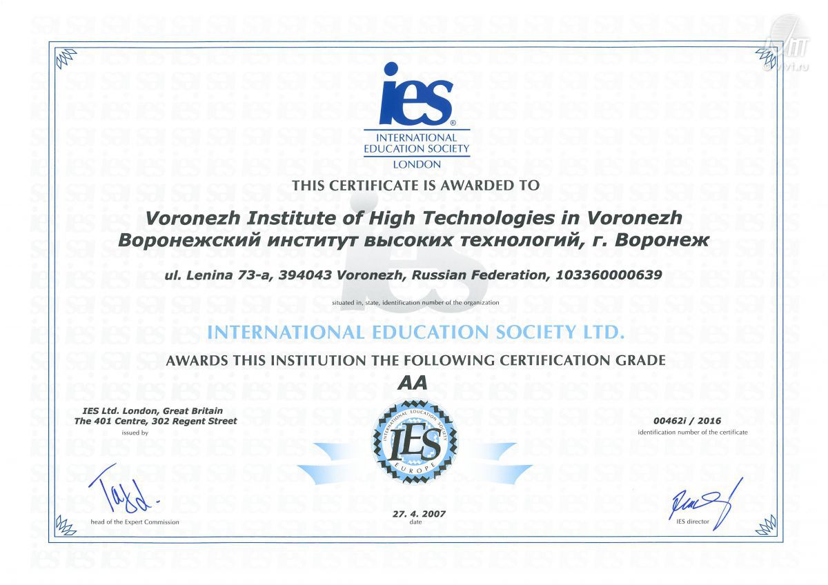 18 мая 2016 года ВИВТ получил экспертное заключение комиссии International Education Society, Ltd. по международной ресертификации вуза. По решению экспертной комиссии IES текущий рейтинг Воронежского института высоких технологий A + (топ учреждение с международным опытом) увеличен до уровня АА (топ учреждение, получившее международное признание и мировую известность).